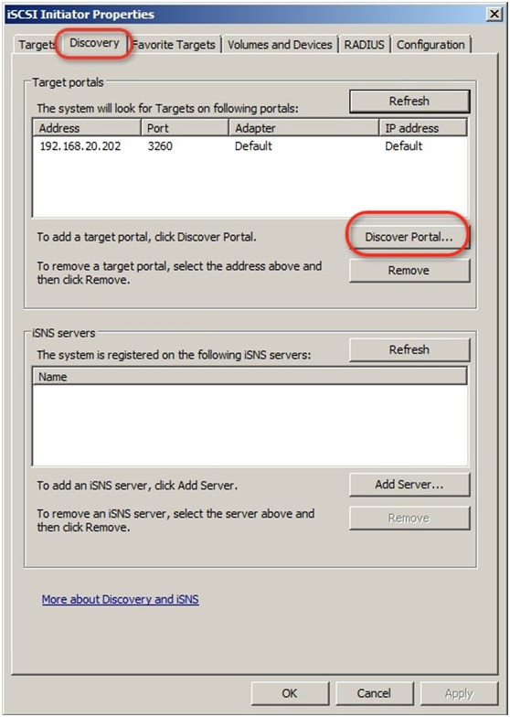 - Введите IP-адрес или имя DNS для ISCSI LIO, который выполняет роль ведущего хоста iSCSI Target, затем нажмите OK.