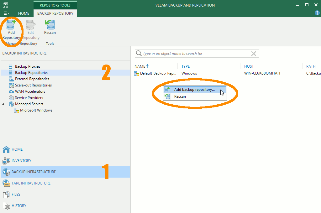 - В меню в верхній лівій частині вікна оберіть Backup Repositories